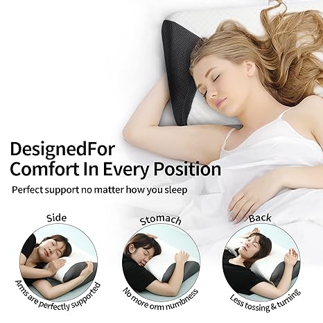 There are specific grooves for your arms to sleep comfortably. You can lie on your stomach with your arms wrapped around the wings for perfect support. Suitable for all sleeping positions, this memory foam neck pain pillow is an ergonomic orthopedic pillow made of memory foam. High-quality firmness without being too soft when lying on your back or side, maximizing relaxation of head, neck, shoulders, and back muscles When you are still struggling to find the right height pillow, there are 2 different heights on both sides of our neck pillow for you to choose, so you can choose the one that is more suitable for your sleep. Helps support and maintain your head, neck, shoulders, and back in a neutral position so you can sleep undisturbed and wake up refreshed
