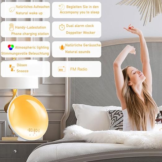 This alarm clock with light not only wakes you up gently with a warm sunrise effect but also uses a sunset simulation to help you unwind and prepare your body for a restful sleep. This alarm clock has a 0-20 level light adjustment function, allowing you to choose the appropriate brightness according to different scenes and moods, creating an ideal lighting atmosphere. With a countdown function of 10-240 minutes, it accompanies you to sleep. The ambient light can help you relax and fall asleep more easily. The alarm clock provides personalized settings to cater to your unique needs. The dual alarm function allows you to set two different wake-up times, making it perfect for individuals or couples with different schedules.