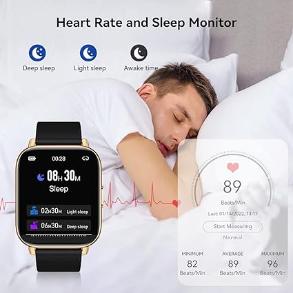 The waterproof smartwatch for iPhone supports outdoor running, swimming, yoga, cycling, skipping, badminton, table tennis, walking, basketball, etc. This fitness watch tracker records calories, steps, and distance, and you can also track GPS routes In the phone app “GloryFit”. This fitness watch is a collection of many commonly used exercise modes. It’s a great activity tracker watch for people who love working out. Smartwatch for Android phones uses high-performance sports optical sensors, monitor your HR, BP, and sleep tracking, and analyze your sleep quality(deep sleep, light sleep, and wake-up time) which can help you better understand your health and make a reasonable adjustment to your lifestyle. Smart watches for women and men also have the features of sedentary and drinking water reminders. The sport fitness watch for women and men works for around 7 days of daily use and up to 30 days of standby. Don’t need frequent charging every day, which is great, isn’t it? Big touch screen smart watch with IP68/5ATM waterproof level can meet your daily needs. Whether it’s a rainy day, wash your hands or take a shower. This black and gold smartwatch negro y oro is a good gift for any holiday, like Father’s Day.