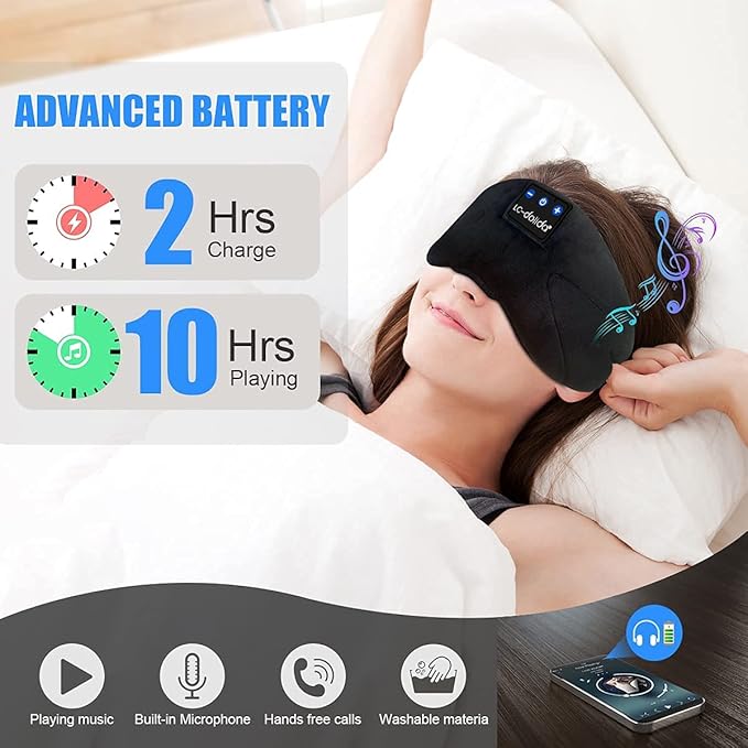 The LC-hidden Bluetooth sleep mask has built-in the latest Bluetooth V5.2 technology and updated speakers, which can be connected from a far distance, providing HD stereo with excellent sound quality. It can reduce the ambient noise without using earplugs for painful conditions and help you fall asleep. The Bluetooth sleep mask can be paired with any Bluetooth-enabled smartphone or tablet faster and easier within 33 feet. For everyone’s needs, we upgraded the Bluetooth chip to achieve two goals: a stronger signal and faster transmission. ENJOY ZERO LATENCY: Sync audio and video perfectly for more stable connectivity. Give you the best movie experience. No fear of signal delay in the game. The unique nose baffles design can block almost all the light and fit your nose in a better way, keep you completely in the dark, and make you feel sleepy faster. The surface is designed with breathable fabric, which can give you a skin-friendly and cool feeling. Perfect choice for men, women for naps, insomnia, travel, shift work, yoga, relaxation, audiobooks at home, in the office, in the car, or to block the light of electronic devices.