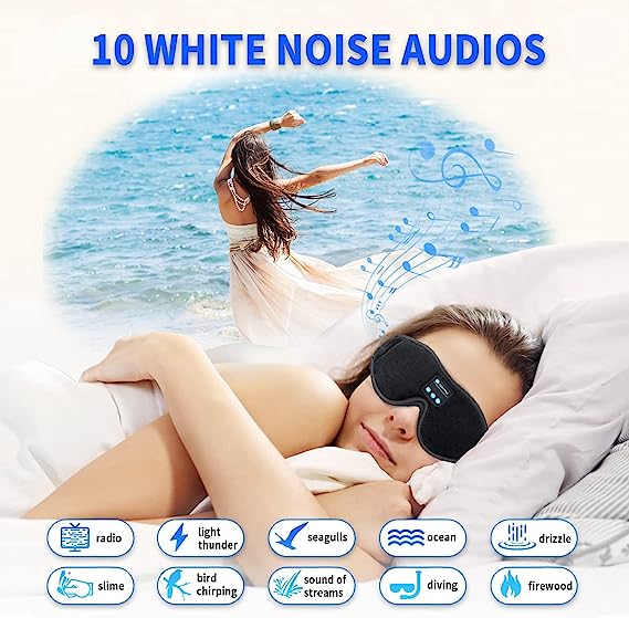 Sleep headphones perfectly combine bluetooth 5.0 sleep eye mask with white noise machine. 10 white sounds include radio/ light thunder/ oceans/ bird chirping