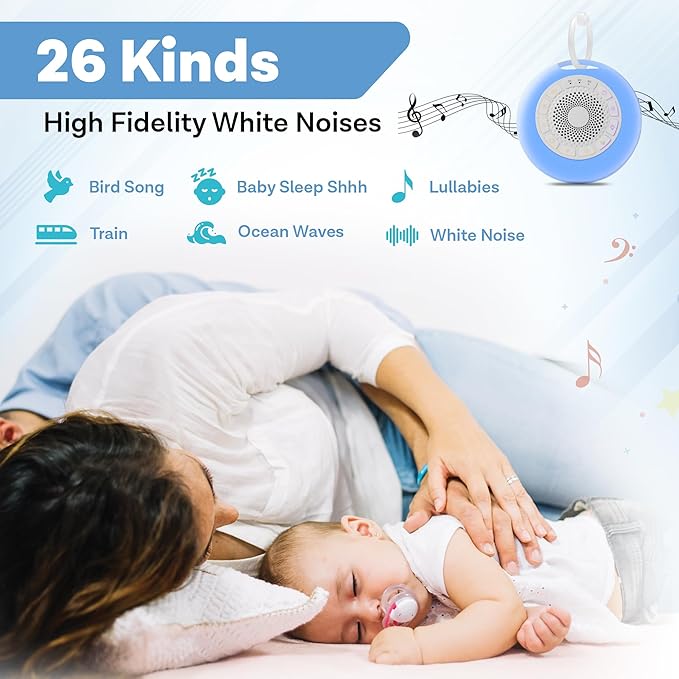 This hatch sound machine offers 26 soothing sounds to calm your baby for a peaceful sleep. It also features a white noise sound machine function to help mask disruptive environmental noises. 7 white noises, 7 fan sounds, 12 natural sounds (Lullaby 1, Lullaby 2, Lullaby 3, womb sounds, train, running water, rain, ocean, bonfire burning, birds, baby Shhhh, night summer ) Integrated with a 7 colour night light and 3 warm lights, this portable sound machine baby is perfect for creating a soothing environment for your baby’s bedtime. This baby essentials features a safety child lock to ensure that settings cannot be altered by young children or babies. Rest assured that the light, sound, and volume will all stay on the correct settings during use.
