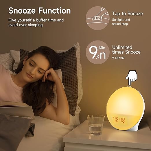 Unlike a regular alarm clock, the upgraded sunrise alarm clock wake-up light has more innovative alarm methods: the sunrise lamp gradually changes color and brightness from dark red to bright yellow within 10-60 minutes before the alarm setting time. Simulating natural dawn and sound. Besides, it can also simulate sunset by dimming the light from 100% to 0% for a duration of 10-240 minutes and provide 7 natural sounds & FM radio to assist sleep. With only one device, the user can set 2 different alarm settings for two different scenarios. More importantly, the upgraded alarm clock realizes the ALL-DAY alarm, Weekday alarm, and Weekend alarm. Besides, the sunlight alarm clock features ergonomic, user-friendly buttons that make it easier than ever to change the settings on the alarm clock. You just need to press the “Snooze” button, and you will get an additional 9 minutes to sleep. Unlimited times Snooze. 15 color-changing lights you can choose,7 pure color lights & 8 mixed color lights. 20 brightness and 16 adjustable volume levels. 3-level LED time display brightness. Making it perfect as a night light, reading light, or bedside lamp. Double-press the button to turn on the colorful light mode and select your favorite color to create a romantic mood.