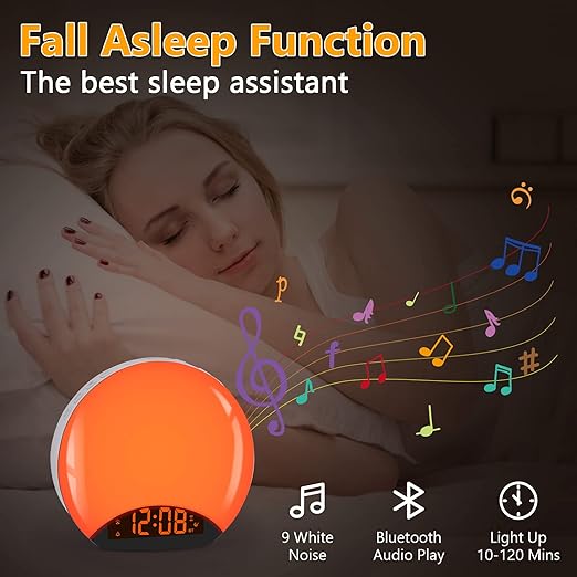 This alarm clock is designed to better naturally wake up heavy sleepers and children by simulating sunrise. Before the alarm goes off (10-30 minutes), the brightness of the wake-up light alarm clock will gradually increase from 10% to 100%, waking you up naturally. Equipped with a 5W high-quality speaker, which can be easily connected to the mobile phone via Bluetooth to enjoy high-quality music playback at any time. You can choose 7 kinds of color-changing lights, including warm white bedside lamp, dynamic sunset red, dynamic aurora green, dynamic ocean blue, RGB dynamic rainbow, RGB dynamic glow, RGB dynamic nebula, colorful color changing, flame burning. The 7-level LED time display brightness and 10-level lighting brightness are adjustable.