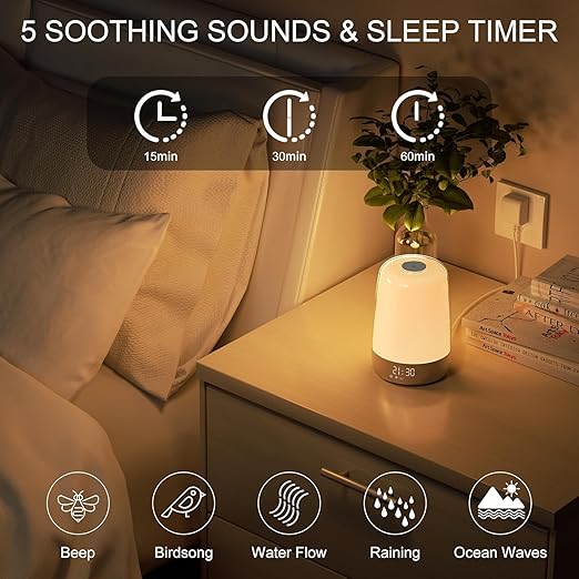 This touch lamp can be widely used for feeding or changing diapers baby late at night, reading or tell the story before sleep, colorful ambient lights can also be used during candlelight dinners or watching home theater. Such a cute and versatile nursery night light is also suitable as a gift option. Night light for kids simply keep tapping the metal panel a few seconds of this touch table lamp, you can change the mode to warm white mode or atmosphere lights mode. warm white light has 3-way dimmable brightness, RGB ambient lights with 6 color choice. Add this illusion to the night, more unlimited scenes and romance. Snooze mode Intimately designed to relieve worries in the morning, if you do not manually turn off the alarm in five minutes after the ring, the alarm will automatically restart after the next five minutes. As well you can choose your favorite voice from 5 nature sounds.