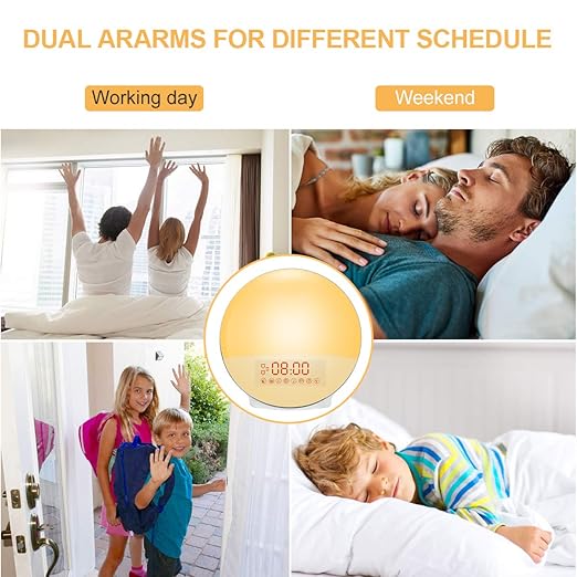 Changing color and brightness gradually, you can set its lighting time, brightness, and alarm volume as you need; this method of waking up gives your body a chance to wake up more slowly and naturally, eliminating being jolted out of a deep sleep, especially in cold, dark mornings and winter months. setting the brightness, duration, music, and volume first, it will gradually fade to darkness, having the room slowly dim, really does help you relax and ‘turn off’ your brain to wind down, and fall asleep more easily. it has two alarms, and each can have sound and/or light, 2 alarm options make it great for setting weekends; or one for you and another for your wife or husband. The snooze button allows you to snooze and get up 9 minutes late.