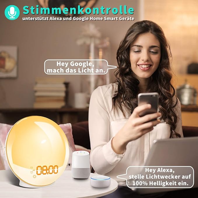 Stimulate your body with light and wake up in a more natural way. During the preset time, the light gradually increases from 1% to 100%, so you wake up slowly from a deep sleep. The alarm time (10 to 60 minutes) and the brightness (increments of 0 to 20) can be adjusted precisely. The light alarm clock has a stop function. Simply press the “Snooze” button during the alarm, and the sound will be stopped. The app-controlled alarm clock can be set up with your mobile phone via Wi-Fi. Compatible with Amazon Alexa, Google Assistant, and smart voice control. When the set alarm time has expired, the alarm light will sound with a soothing, natural sound, which gives you the feeling of living in nature. Or you can set your favorite FM radio station as the alarm sound.