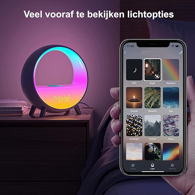 Wake up naturally in the morning, set the mood for the evening, listen to music with a Bluetooth speaker, and tidy up the room with the combined and smart functionality of the Inga Smart Sunrise Smart Alarm. The Inga Smart Sunrise Smart Alarm is a WIFI connected and app-controlled device that provides easy installation, automatic time setting, and weather display. Customize your alarm clock with a colorful sunrise simulation or choose from 8 different lighting effects and 8 natural sounds. The light will gradually turn on 10 to 30 minutes before the desired wake-up time to wake your body, and a tone of your choice is played progressively at alarm time.