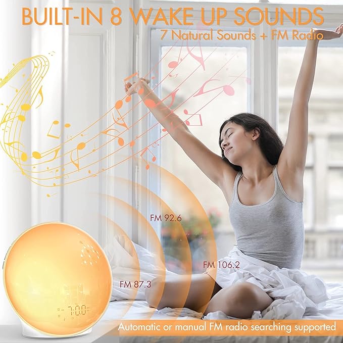 Full-color screen Wake-Up Light with sunrise simulation to help you ease out of sleep. It starts to emit light 10~60 minutes before the alarm time, and 20 brightness levels can be adjusted gradually. And choice of 7 alarm sounds or FM radio can be used as a wake-up sound. With 7 colors of light, including red, orange, yellow, green, blue, indigo, and purple, as well as RGB mood light for creating a romantic and soothing ambiance, it’s more than an alarm clock. You can choose the light mode you like, as mood light/night light/bedside lamp/reading lamp, with 10 brightness settings. A great gift for your loved ones. Built-in 2 alarm clock settings, both alarms can be set for daily alarm/weekday alarm/weekend alarm by sliding the corresponding switch, it can be used to set alarms for weekday and weekend separately as needed. And the specially designed tap to snooze button allows you to enjoy unlimited additional 9 minutes for snoozing. Anti-slip rubber base helps keep the light from shifting on a bedside table and is stable.
