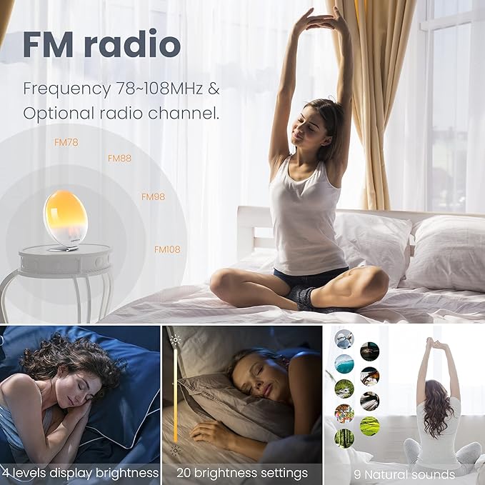 The wake-up light will simulate the sunrise to wake you up more naturally and gradually change brightness from 10% to 100% before your setting time. Besides, the light will gradually dim, similar to sunset, and automatically switch off when it reaches the alarm time. The function of snooze is specially designed for those who need an extra few minutes to improve their mood in the morning. When the alarm goes on, tap the top “Snooze” button to get an extra 9 minutes of sleep time, and this function can be reset up to 5 times. Tap the body gently to switch on the sunrise alarm clock. You can set the light to turn off automatically for 5-60 minutes. Easy to use and works perfectly as a night light, desk lamp, or reading lamp. 7 color options and 20 brightness adjustments create various atmospheres and moods according to your needs.