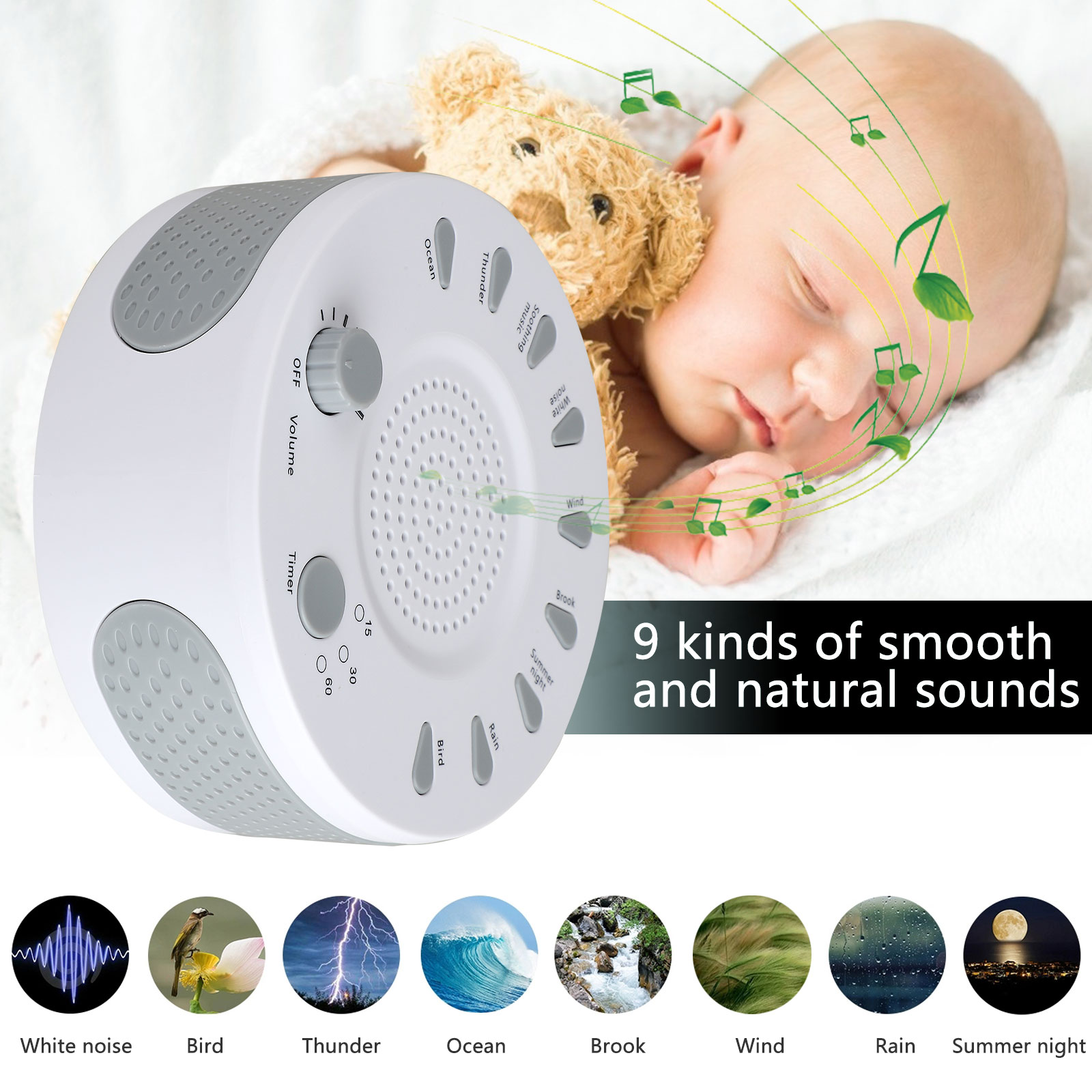 This white noise machine with 9 non-looping soothing sounds: You can get 9 White Noise,like Birds, Ocean Waves, Stream, Thunder and Rian Soothing Sounds. Our sleep sound machine creates the most realistic and natural environment for good sleep, relaxation or meditation and promotes faster and more natural sleep. And with auto-off timer and memory function, you can choose auto timer mode on 15, 30 ,60 minutes and non-stop (all the timer indicator lights are off). The relax sound machine automatically adjusts to the last selected volume, sound type and timer when you turn it on. Lightweight and compact noise machine, easily to work with, in your bag or suitcase. Our noise machine plays soothing sounds, that effectively blocks out background noise, allow you to sleep tight, and get complete focus even in noisy environments. No matter what you do, for office work, business trip or holiday travel, you will be more productive and energetic, enjoy both day and night. Also supporting 3.5mm earphone for private play without disturb others while travel. Gifts for babies and kids, offering soothing sounds rather than disruptive environmental noises, it helps them to fall asleep faster and stay asleep longer.